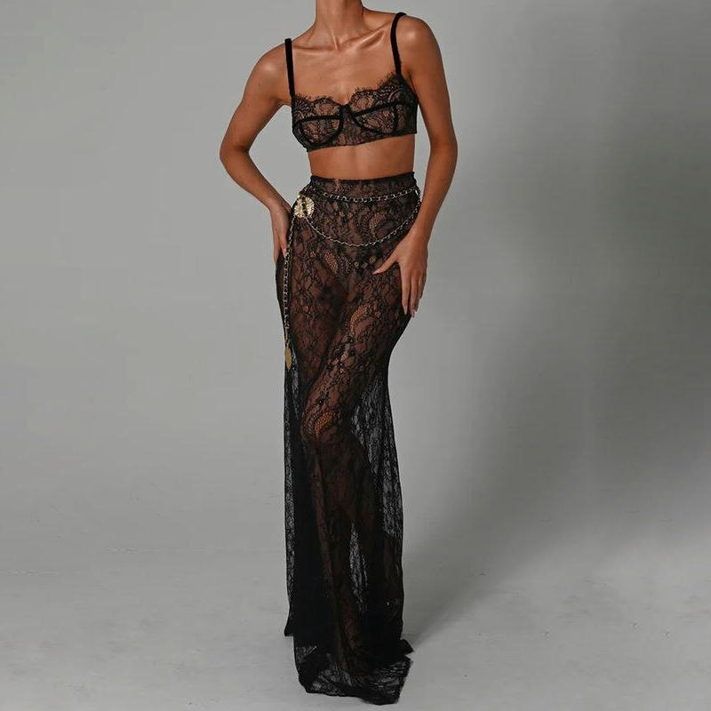 Elegant Lace Two-Piece Skirt Set - Sheath Crop Top with Maxi Skirt for Parties and Beach