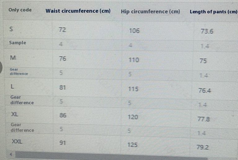 | SIZE | US / CAN | WAIST | HIPS |