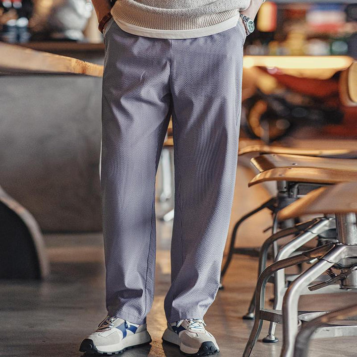 Step into comfort and style with our Easy Fit Striped Casual Pants. Designed for the modern man who values both fashion and functionality, these pants are perfect for any casual occasion. The seersucker fabric is lightweight and breathable, making it an excellent choice for all seasons. The subtle stripes add a touch of sophistication, ensuring you look sharp without sacrificing comfort.