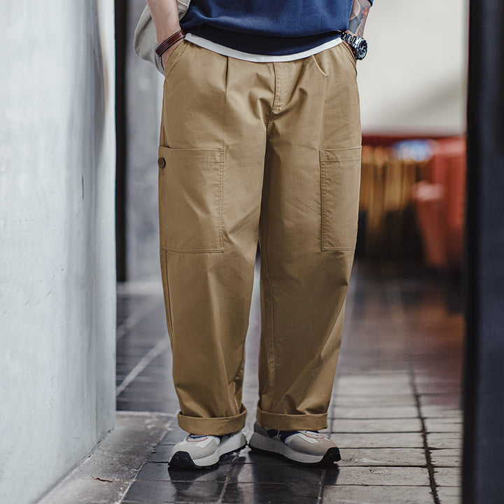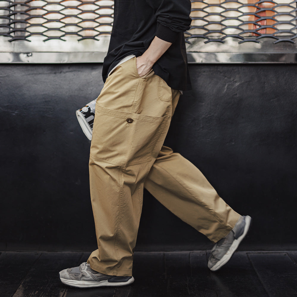 Crafted from a blend of 67.7% cotton, 27.6% polyester, and 4.7% polyurethane elastic fiber, these pants offer a soft touch with just the right amount of stretch. The midweight twill fabric (140g/m²) ensures durability while maintaining a comfortable feel. The wide-leg design provides a relaxed fit, while the multiple pockets add a functional, rugged touch to your outfit.- Material: A comfortable blend of cotton, polyester, and elastic fiber for durability and flexibility.