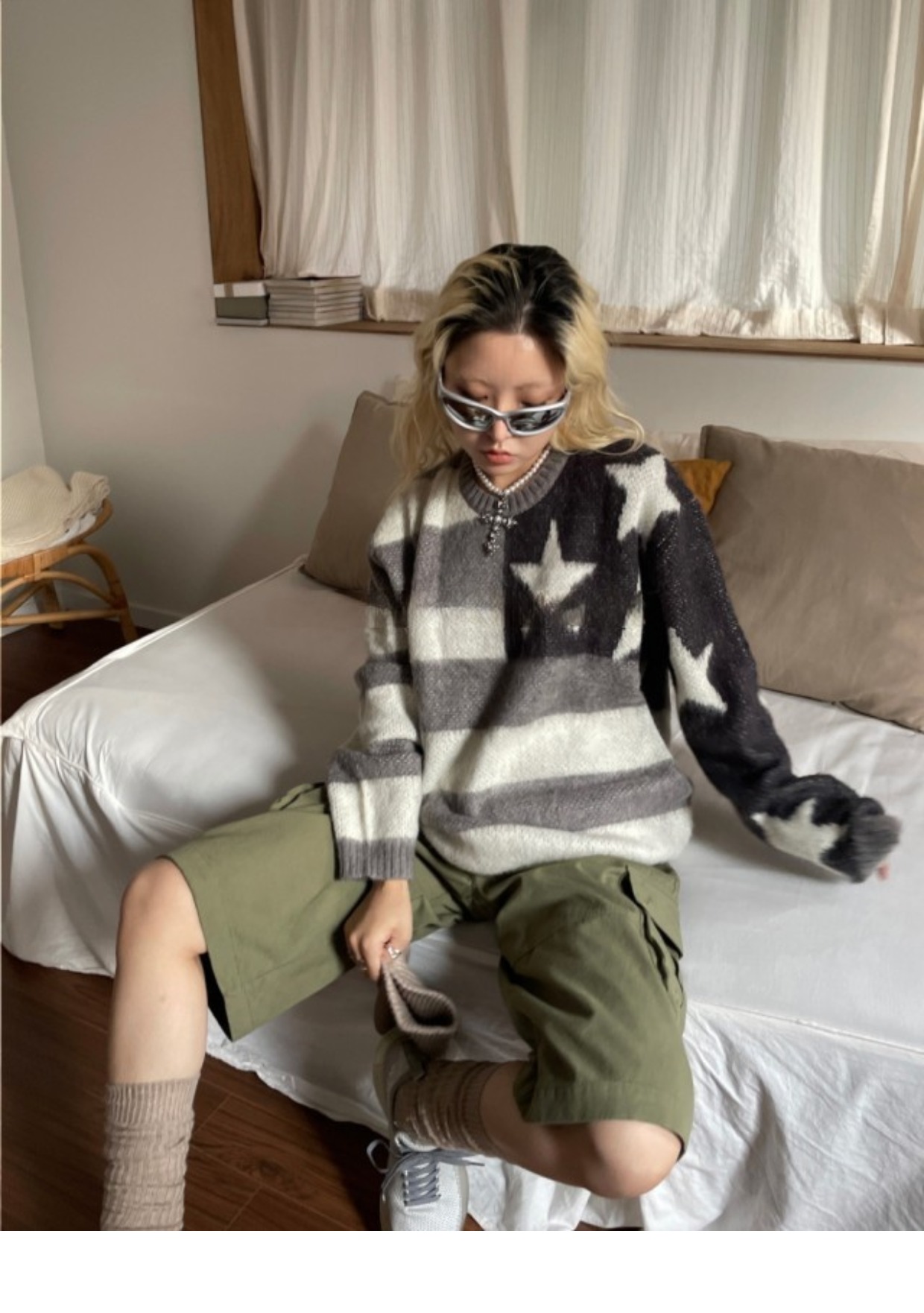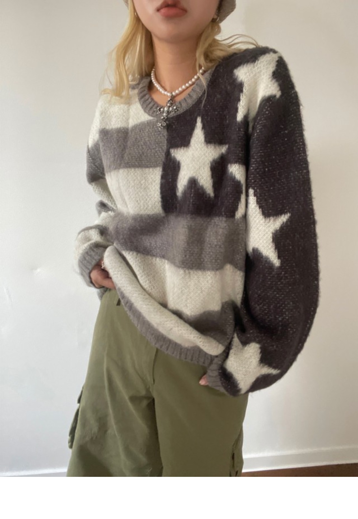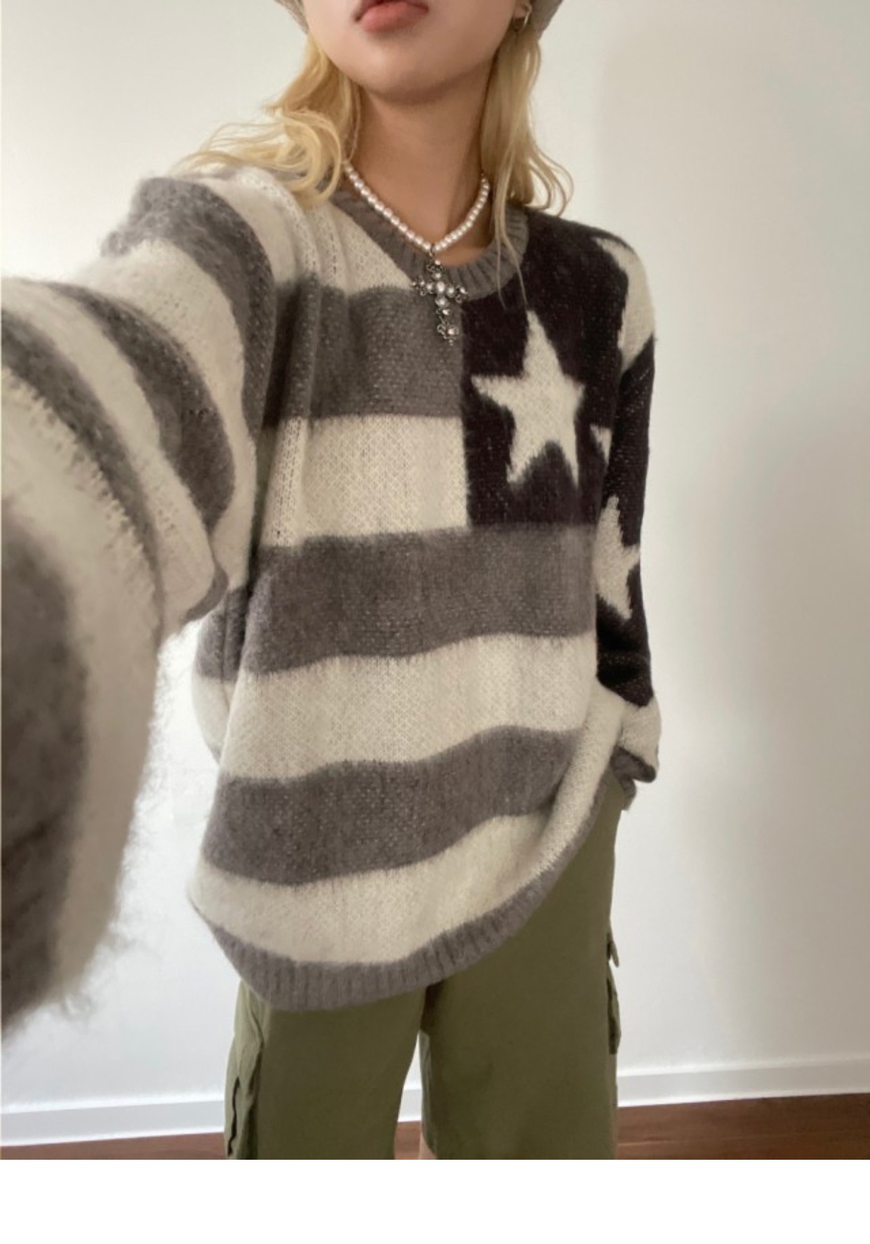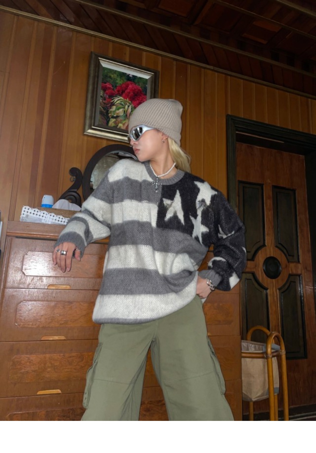 American Vintage Street Fashion Star Stripe Spliced Round Neck Loose Sweater