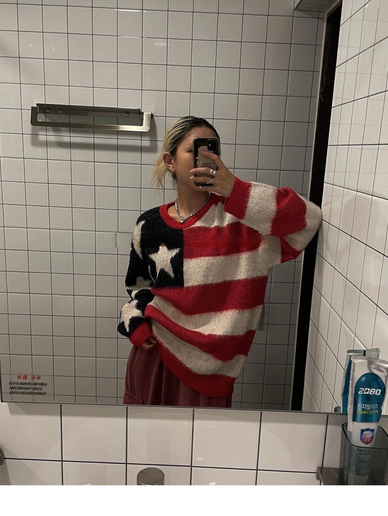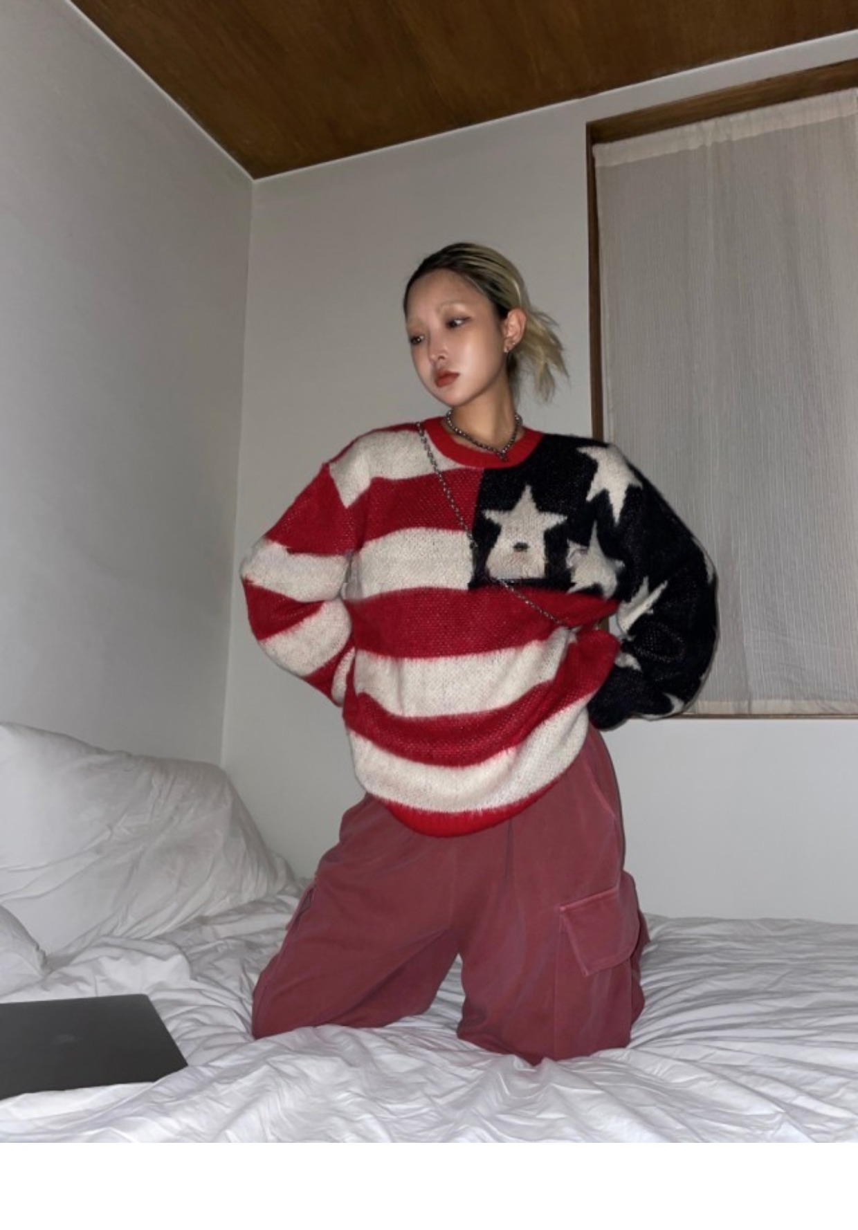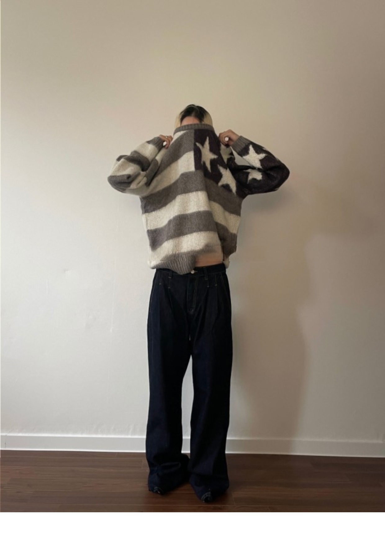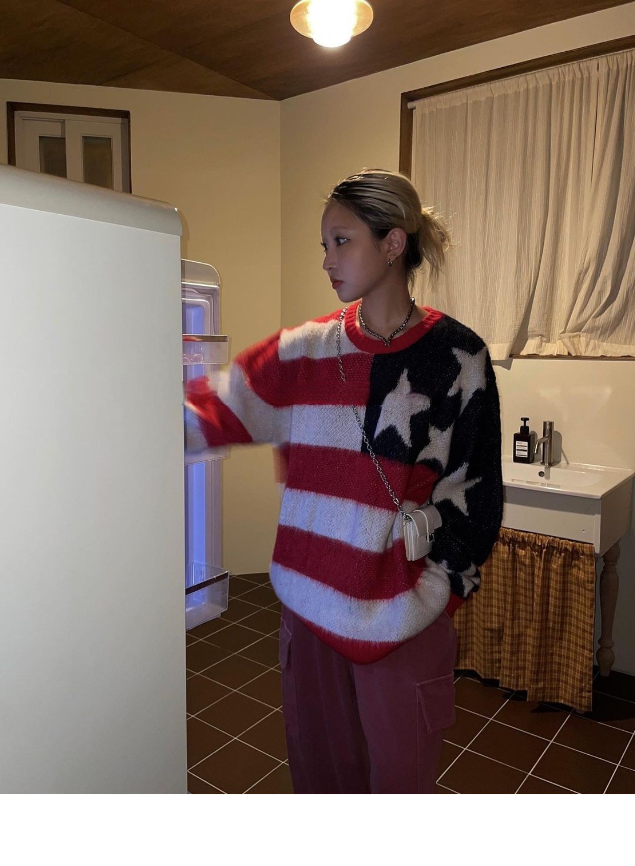 American Vintage Street Fashion Star Stripe Spliced Round Neck Loose Sweater