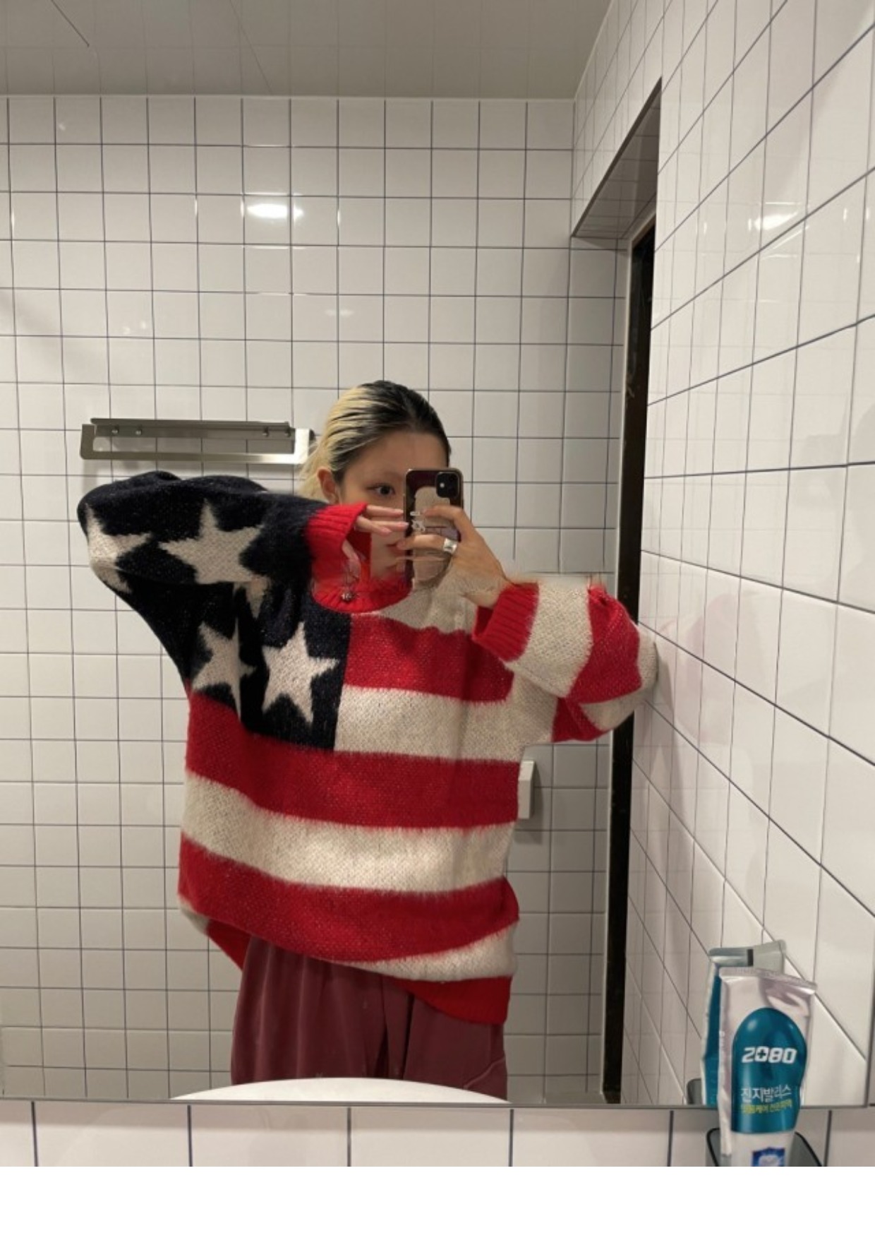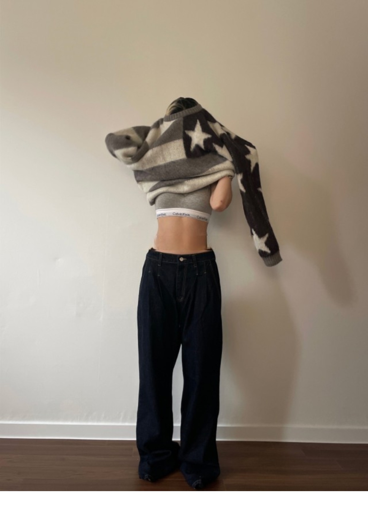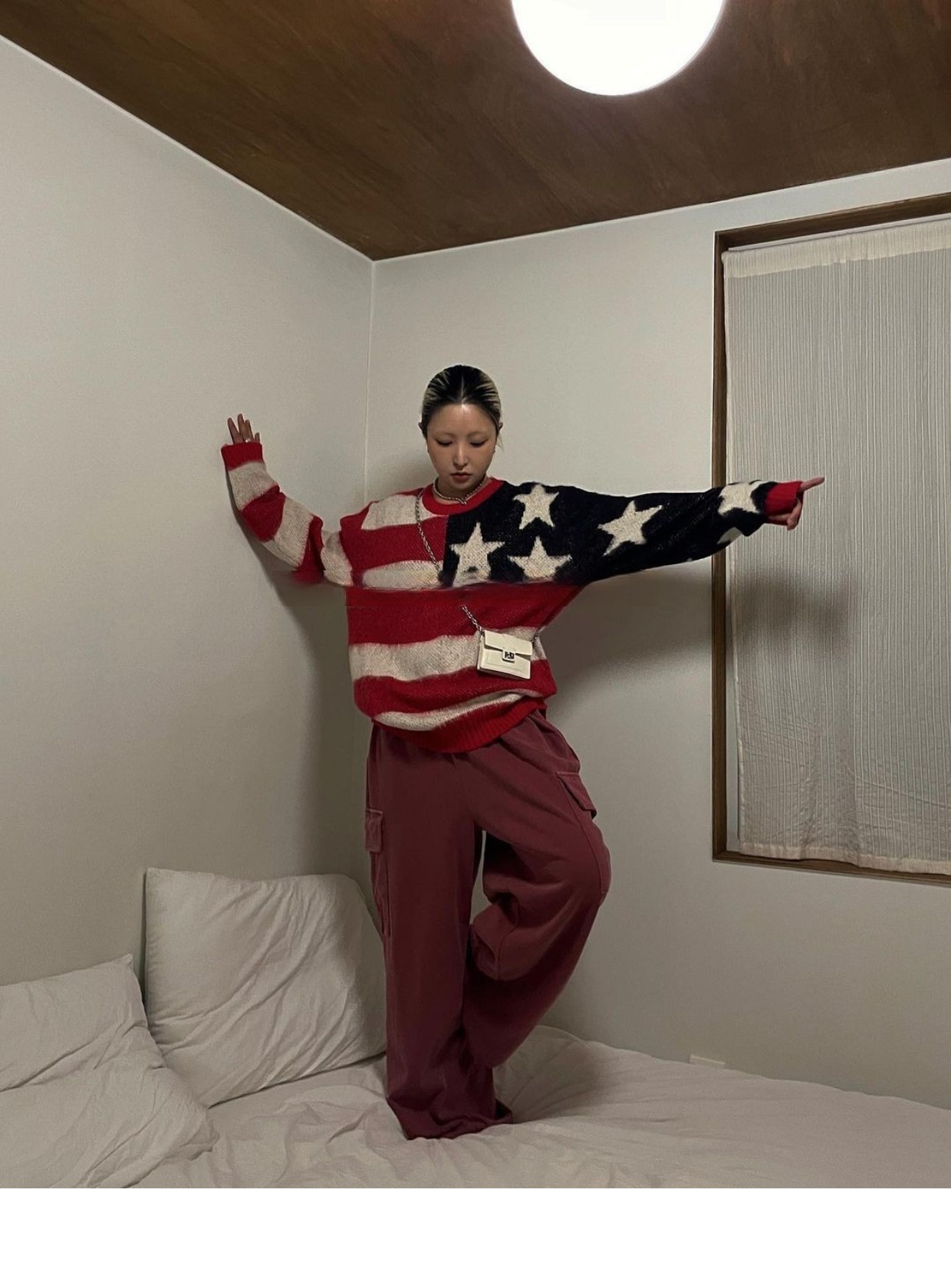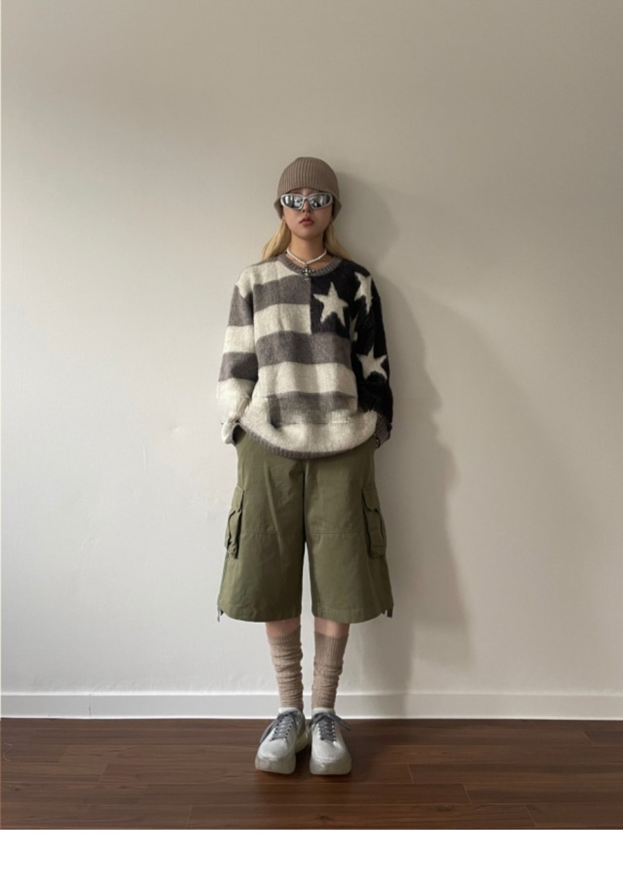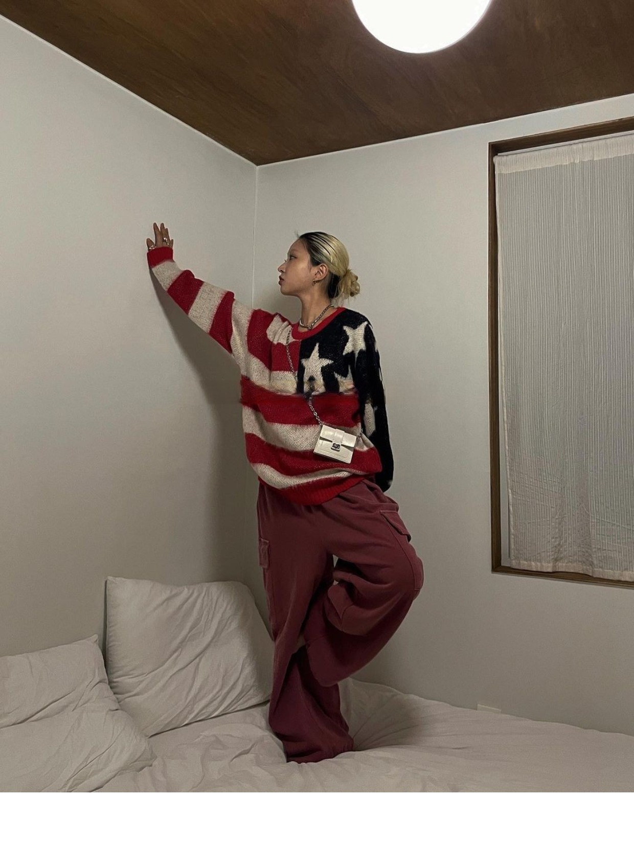 American Vintage Street Fashion Star Stripe Spliced Round Neck Loose Sweater