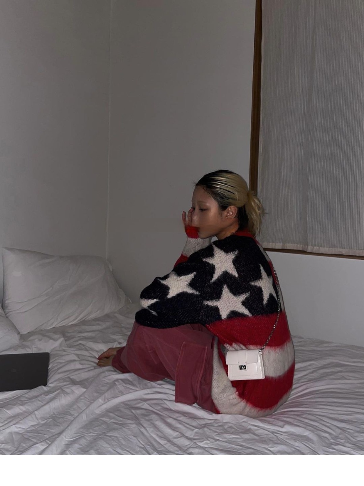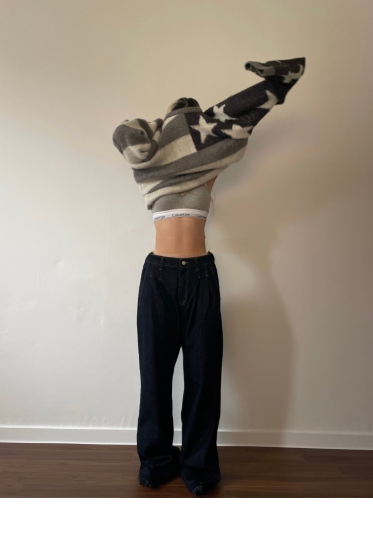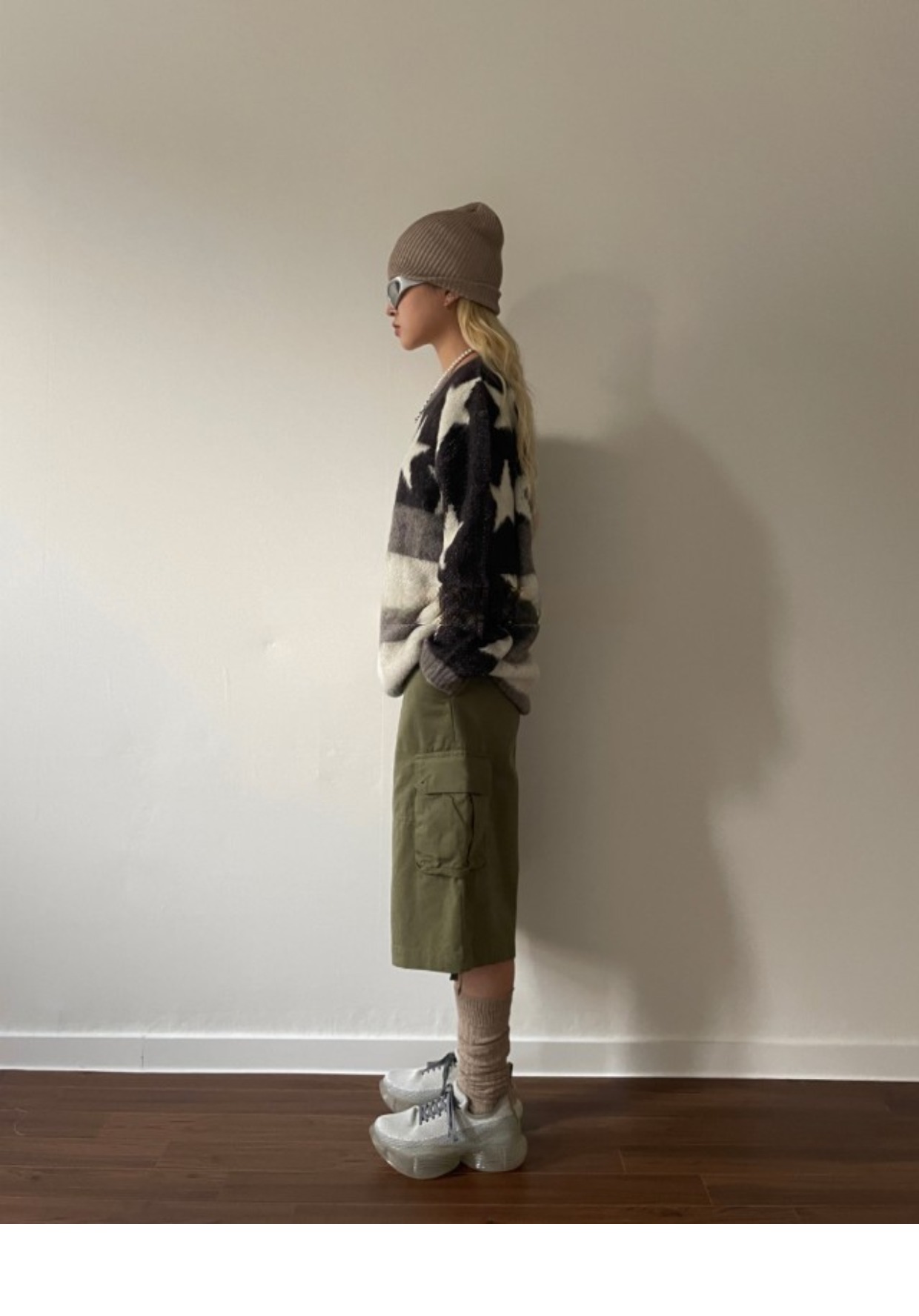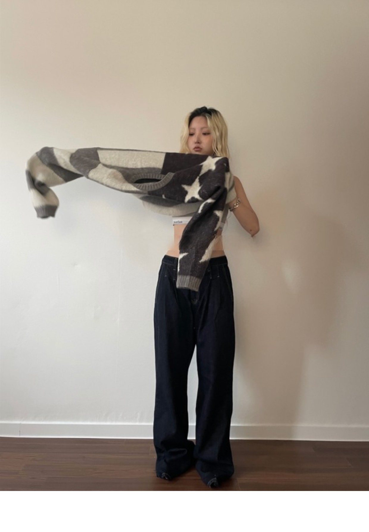American Vintage Street Fashion Star Stripe Spliced Round Neck Loose Sweater