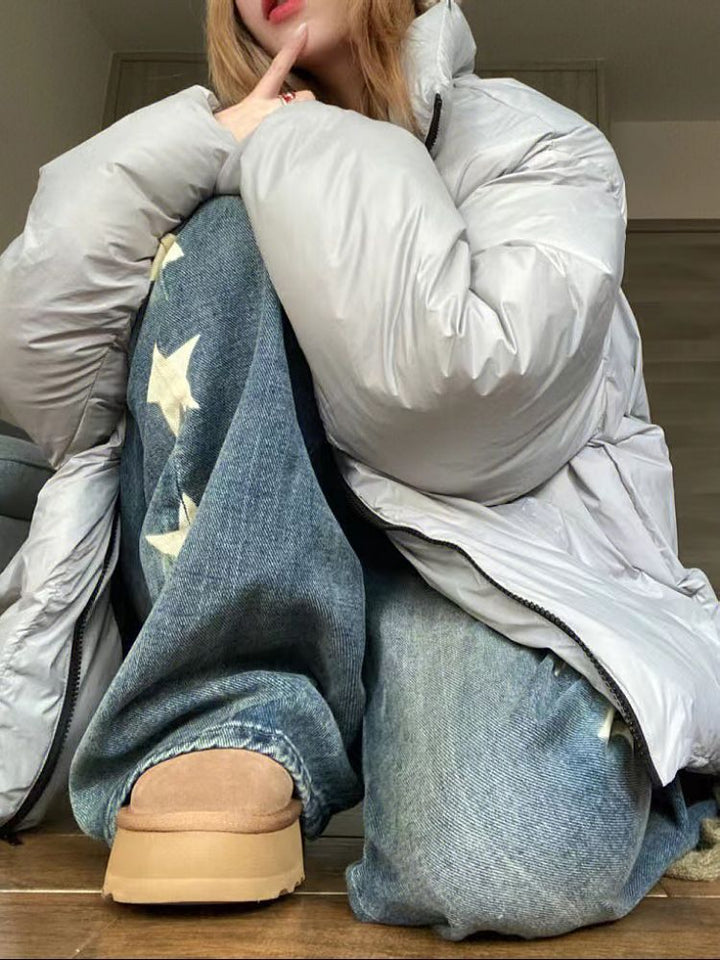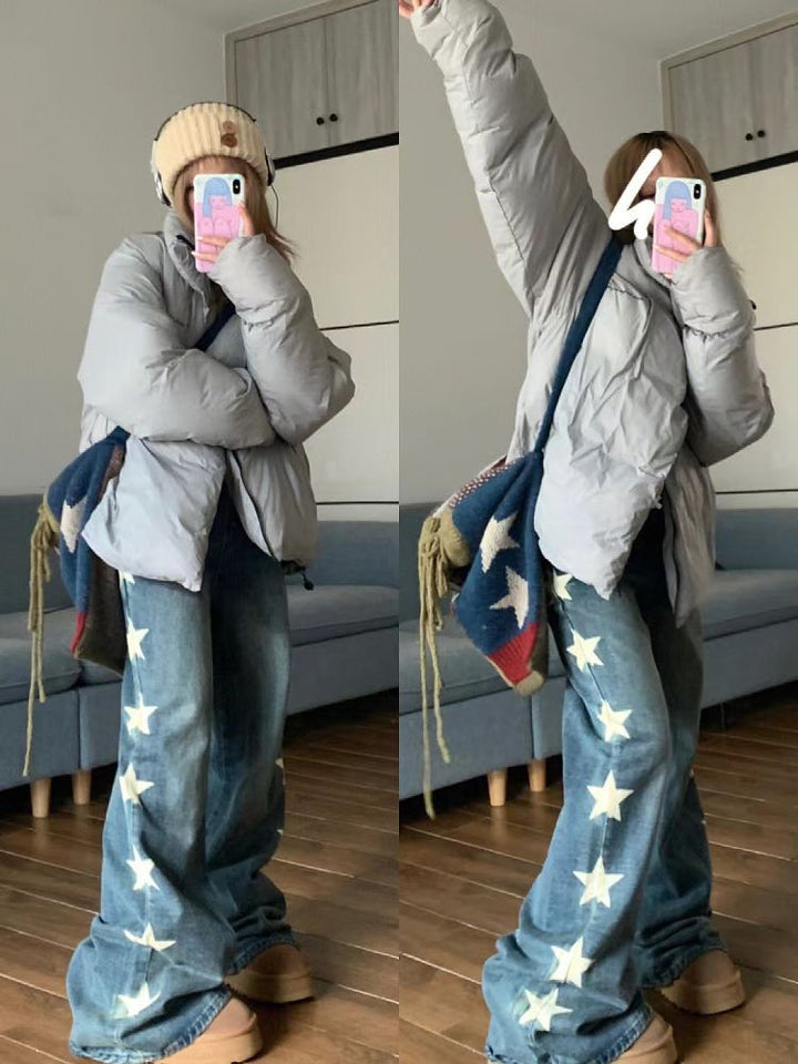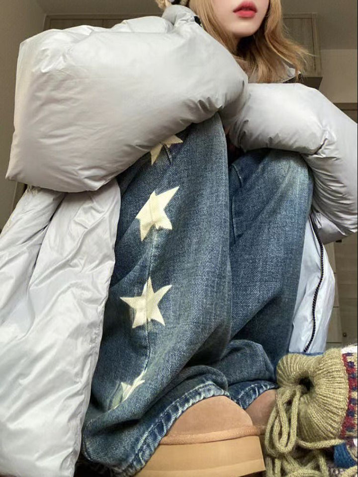 Printed Loose Street Straight Wide Leg Mop Jeans