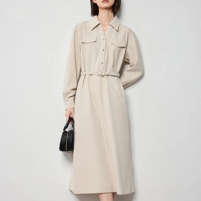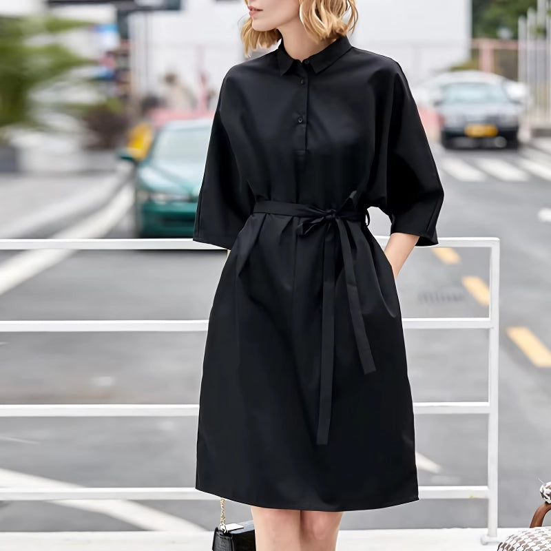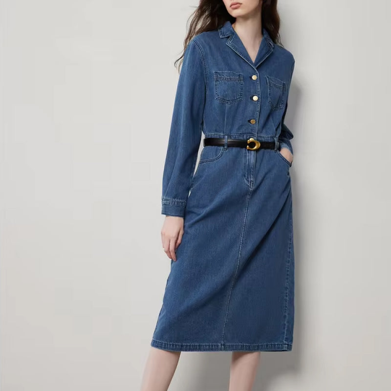Mid-Length Denim A-Line Dress with Lapel Collar and Long Sleeves