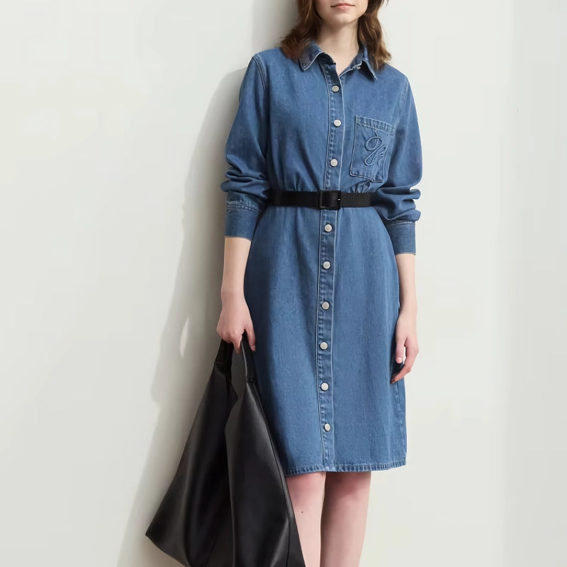 Denim Shirt Dress with Lapel Collar and Letter Embossing