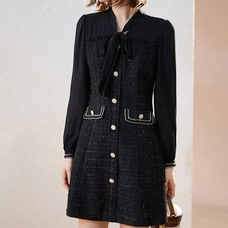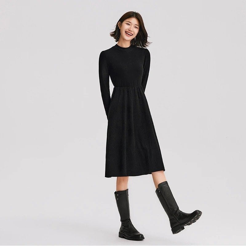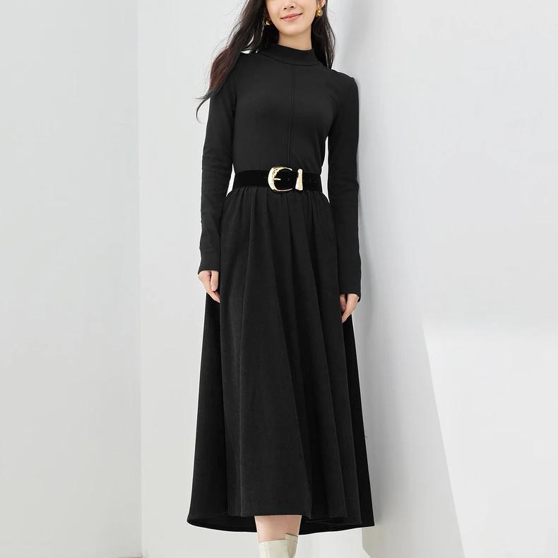 Women's Winter Long Sleeve Half High Collar Black Corduroy Dress