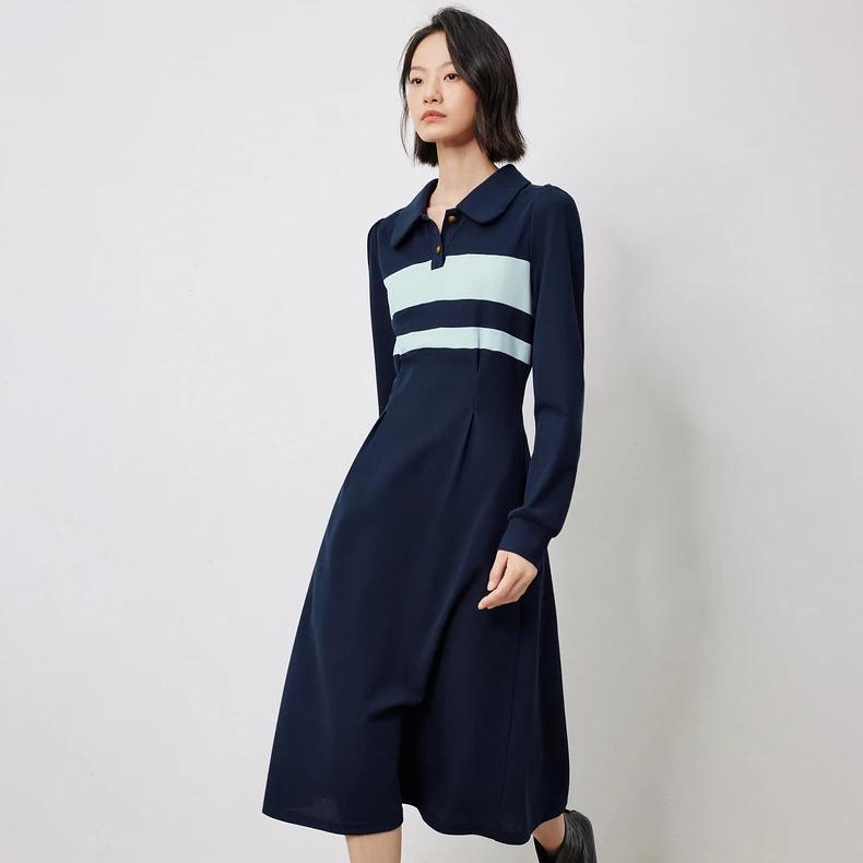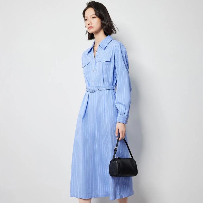 Women's Autumn Blue and White Striped A-Line Shirt Dress