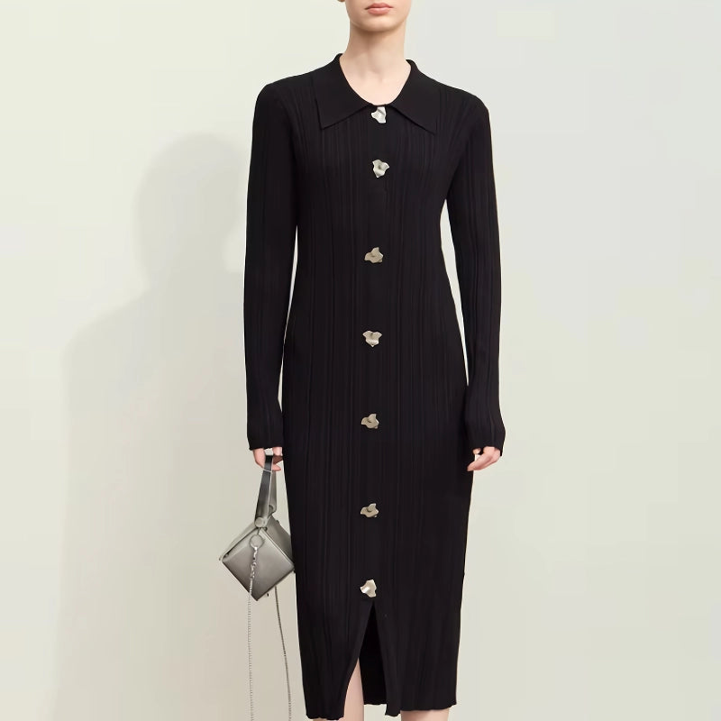 Elegant Retro Lapel Knitted Dress with Metal Buckle