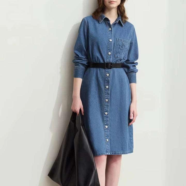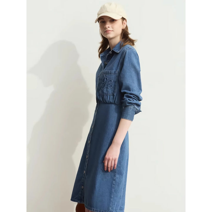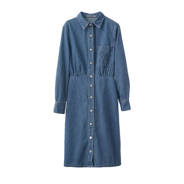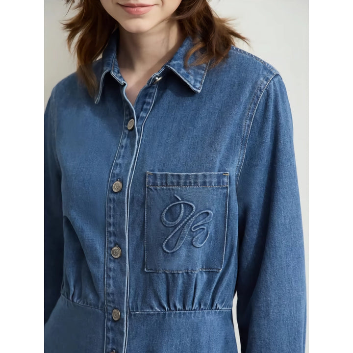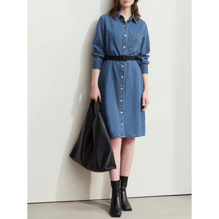 What sets this denim dress apart is its perfect balance between casual and polished. The letter embossing detail adds a contemporary twist to the classic denim shirt dress, while the lapel collar and button closure keep the look refined. With its relaxed fit and versatile design, this dress is perfect for women who want to stay stylish without sacrificing comfort. The high-quality natural fiber blend ensures it remains a staple in your wardrobe for seasons to come.Enhance Your Wardrobe Today
