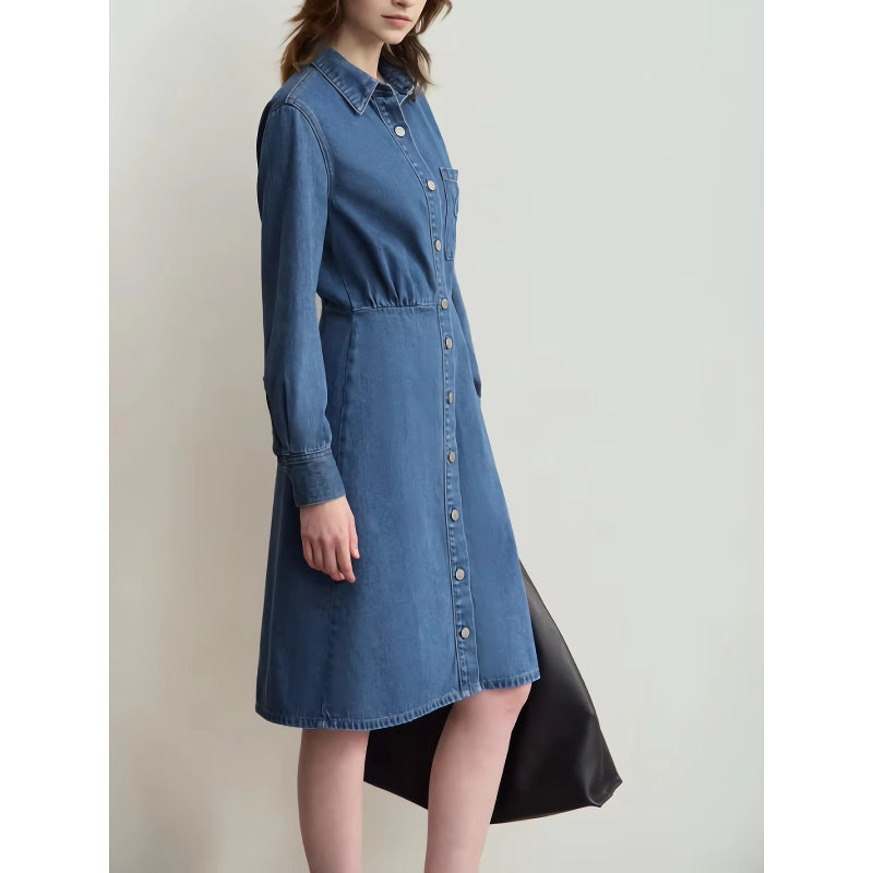 Elevate your casual wardrobe this autumn with the Women's Denim Shirt Dress, featuring a chic lapel collar and subtle letter embossing for a touch of unique detail. Crafted from high-quality cotton and polyester blend, this shirt-style dress combines durability with comfort, offering a soft yet structured fit. Perfect for transitional weather, this knee-length denim dress gives you a relaxed yet polished look, making it ideal for both laid-back weekends and casual office days. The straight silhouette is flattering for all body types, while the single-breasted button closure adds a classic shirt-dress element. Designed with full-length sleeves, this dress is perfect for layering during cooler days, while the breathable fabric ensures comfort throughout the day. Whether you’re out for a coffee run or attending a casual meeting, this dress adds a touch of minimalistic sophistication to your outfit.Key Features