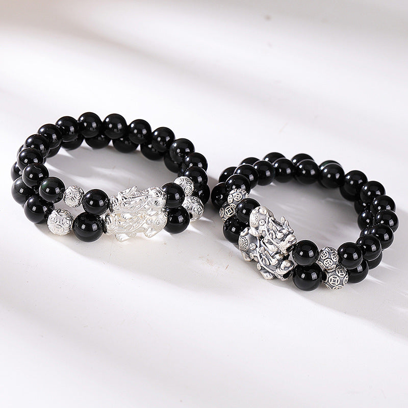 S925 Sterling Silver Obsidian Pixiu Bracelet Plain Silver Versatile Personality