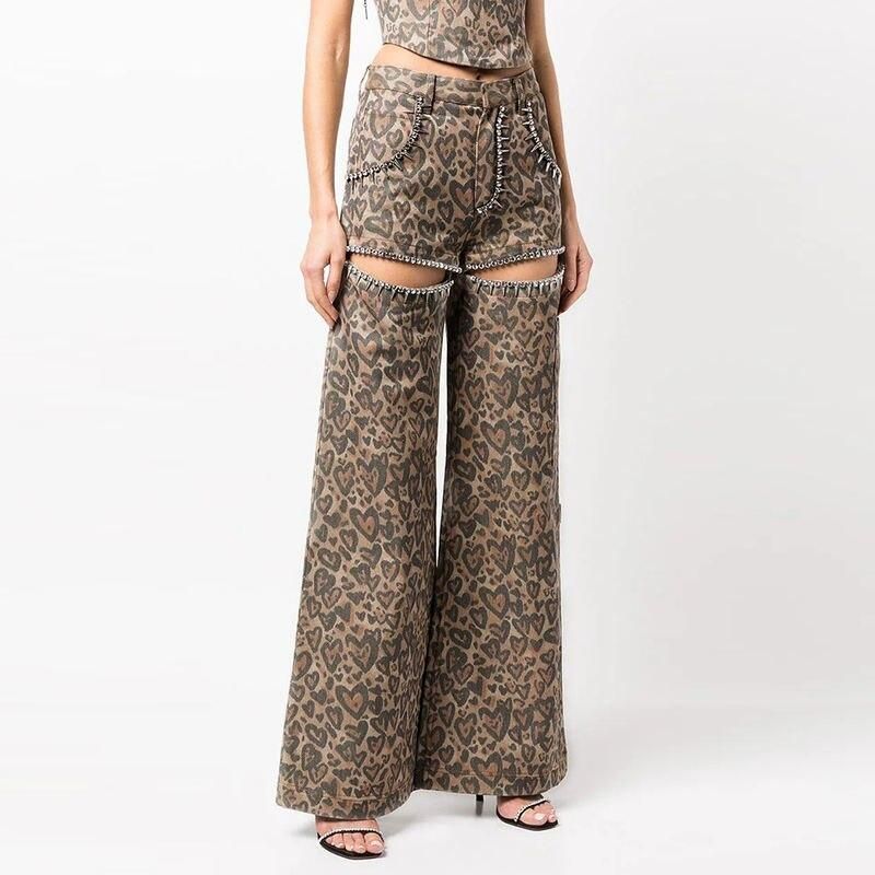High Waist Patchwork Leopard Denim Trousers