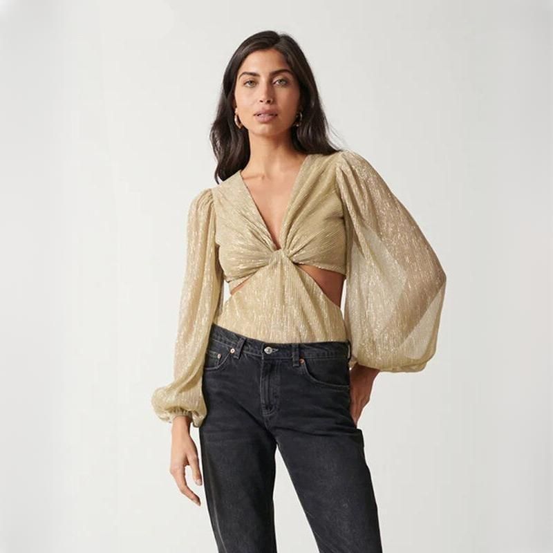 Gold Pleated V-Neck Blouse with Puff Sleeves