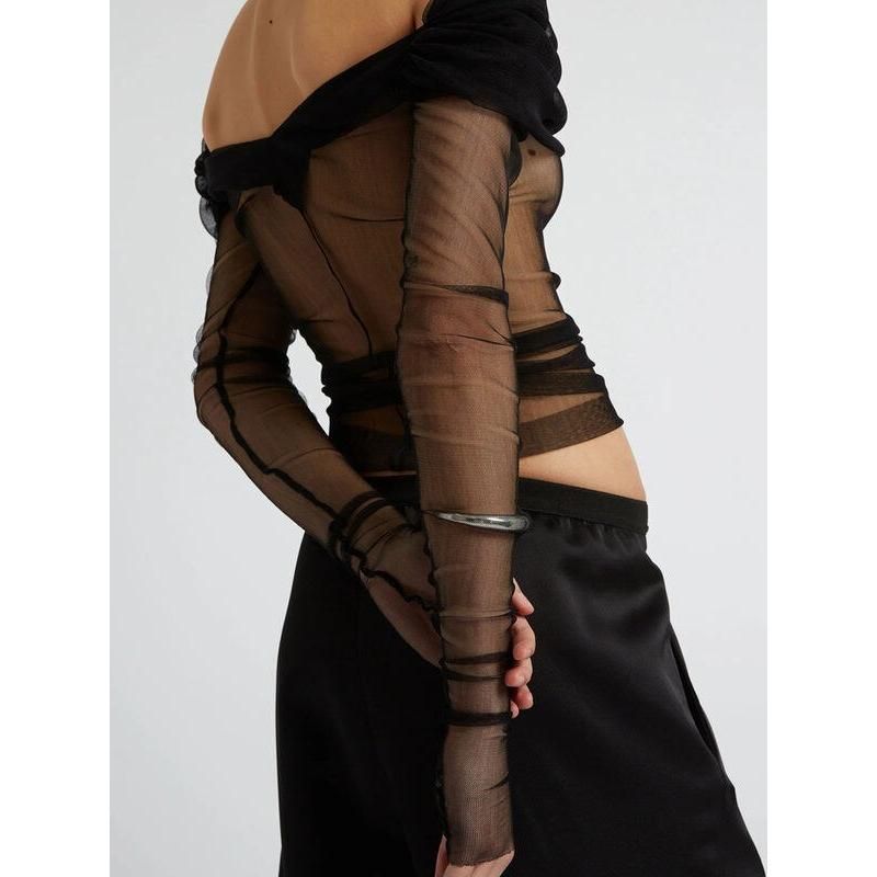 Elevate your summer wardrobe with our Sexy Sheer Mesh T-Shirt – a captivating blend of style and comfort. Embrace the allure of a slash neck, long sleeves, and an off-shoulder, backless design that effortlessly enhances your silhouette. Crafted for the confident and daring, this shirt is perfect for the modern woman who seeks both fashion and comfort.Features