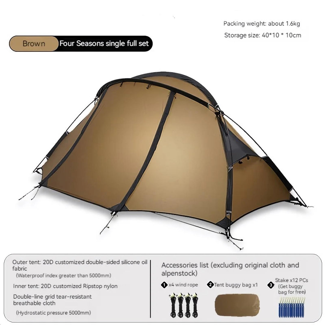 Discover the perfect blend of durability, comfort, and convenience with our Ultra-Lightweight 1-Person Camping Tent. Crafted from high-quality 20D silicone nylon, this tent is designed to withstand the toughest weather conditions while providing a cozy and secure shelter for solo adventurers. Whether you’re trekking through the wilderness or setting up camp at your favorite spot, our windproof and rainproof tent ensures you stay protected and comfortable throughout your journey.