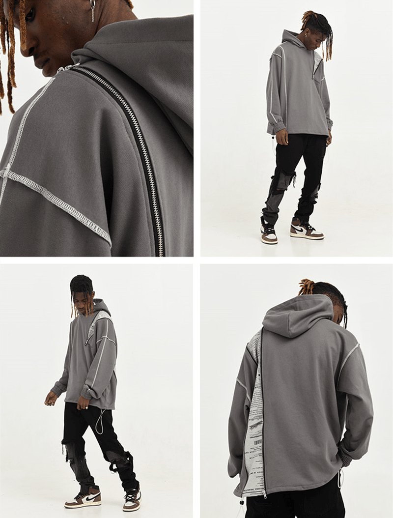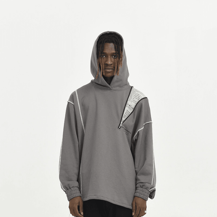 Asymmetrical Zipper Reverse Process Printing Loose Hooded Sweatshirt