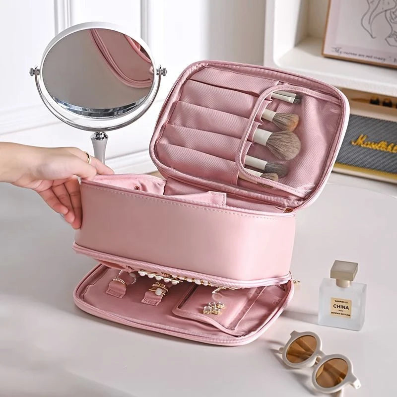 Meet the perfect travel companion for all your beauty and jewelry needs. Our 2-in-1 Makeup Brushes Organizer combines style with functionality, offering a versatile solution for organizing your cosmetics and accessories. Whether you’re heading on a weekend getaway or a long vacation, this waterproof cosmetic bag ensures that everything you need is neatly stored and easily accessible.Smart 3-Layer Design