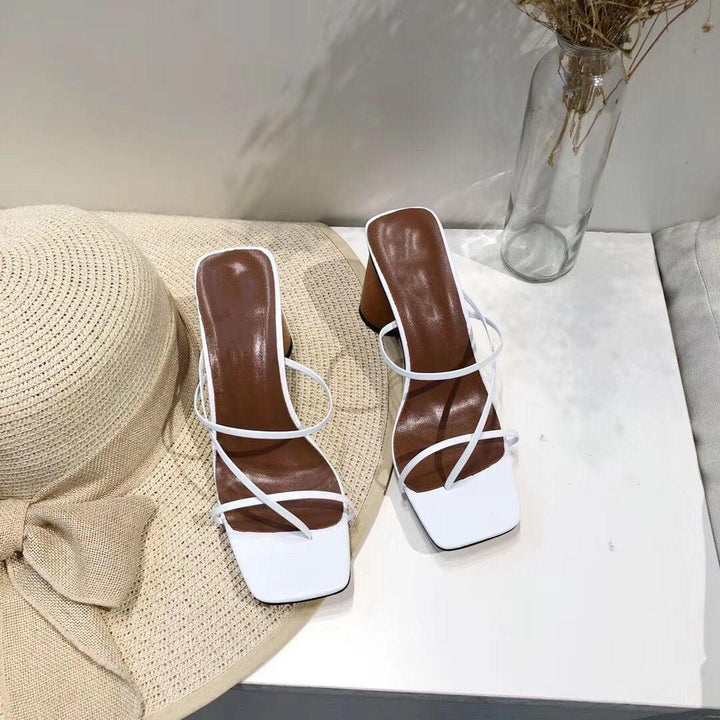 Leather Thin Strap Square Toe Block Heel Women Sandals