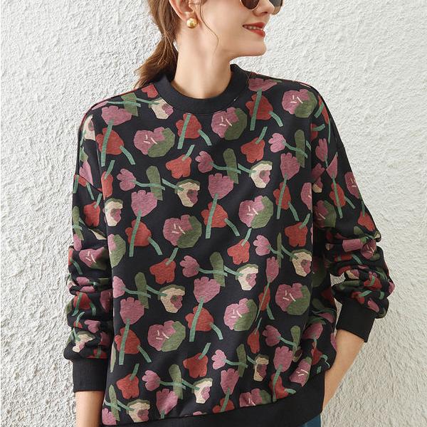 Sweatshirt Retro Floral Print Loose-Fit Pullover - Casual Style