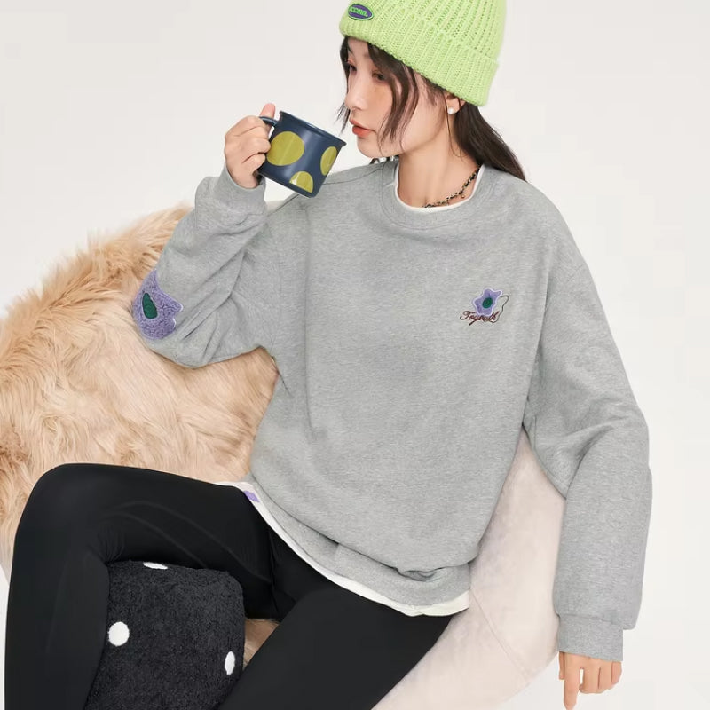 Loose Fit Fake Two-Piece Sweatshirt with 3D Flower Embroidery