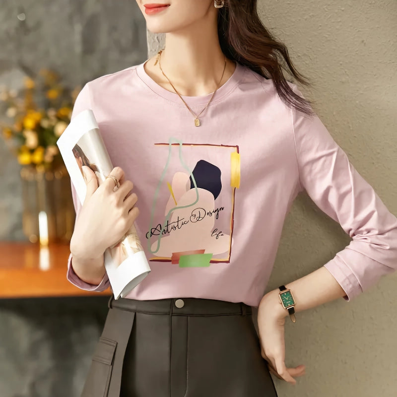 Minimalist Loose O-Neck Abstract Print T-Shirt for Women