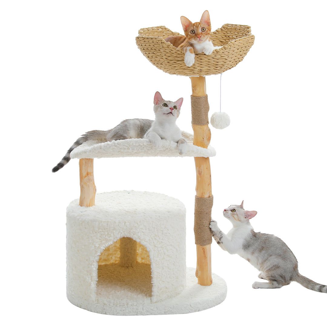 Modern Cat Tree with Woven Basket, Hammock & Solid Wood Scratching Post for Large Indoor Cats