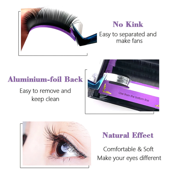 What sets our eyelash extensions apart is their exceptional quality and attention to detail. Each lash is hand-made, ensuring a flawless finish that blends seamlessly with your natural lashes. The synthetic hair used is soft, silky, and glossy, providing a realistic appearance that enhances your eyes without the need for mascara or other eye makeup. Additionally, the customizable thickness and curl options allow you to tailor your look to your preferences, making these lashes suitable for both beginners and experienced users.
