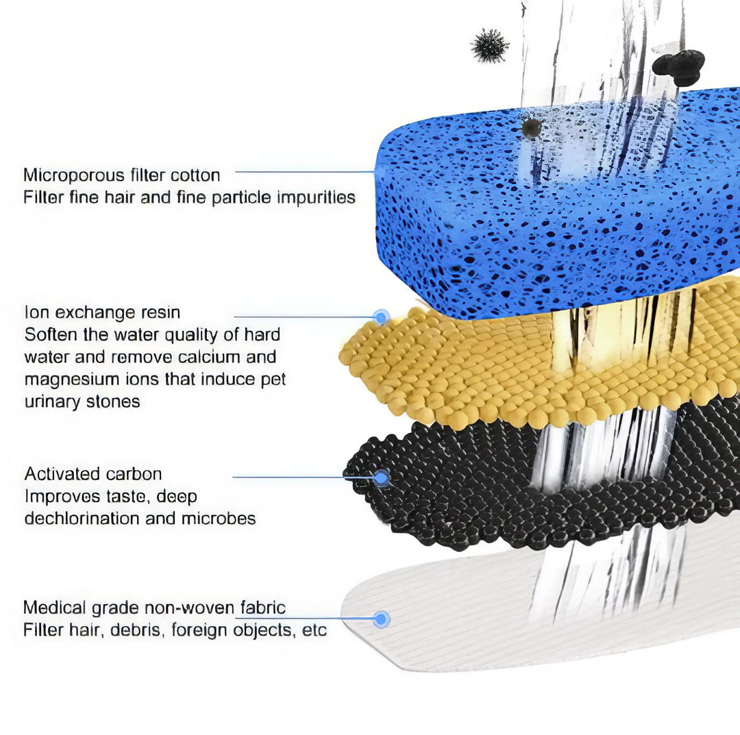 Introducing our Automatic Pet Water Fountain with a generous 2.2L capacity, ensuring your furry companions stay hydrated throughout the day. This innovative fountain features advanced 4 times filtration and purification, guaranteeing pristine drinking water for your pets. Simulating the gentle flow of a cat's head running water, this fountain boasts a faucet design that entices pets to drink more, promoting their well-being and hydration.Key Features: