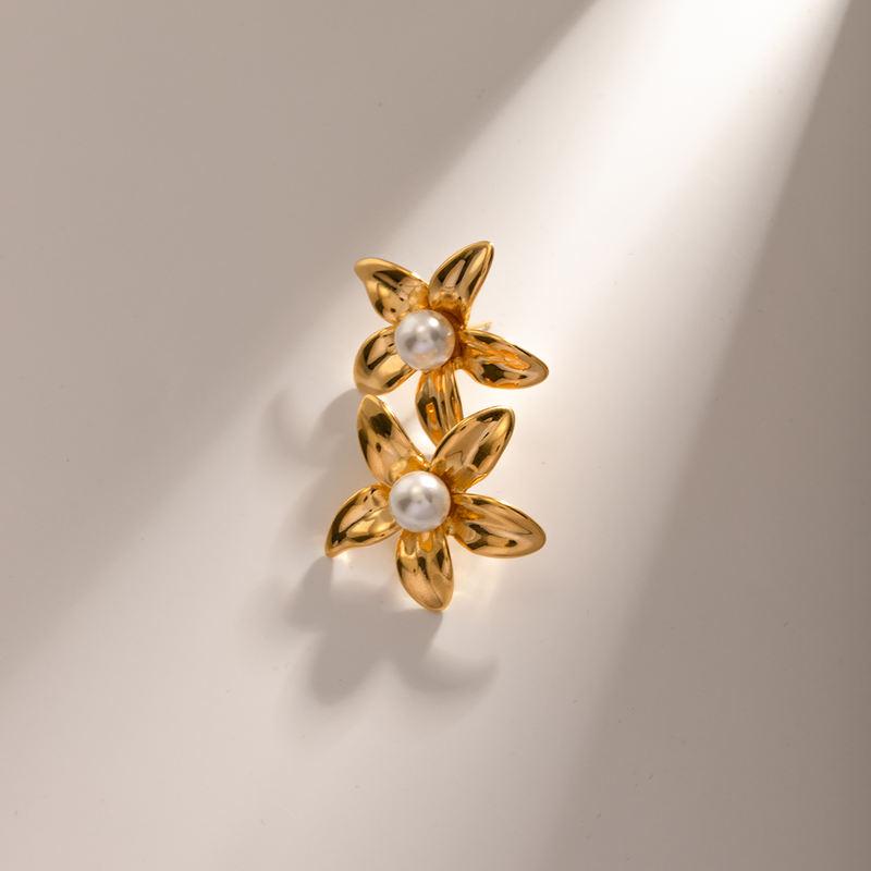 18K Gold Flower Shaped Stainless Steel Earrings with Pearl Inlay