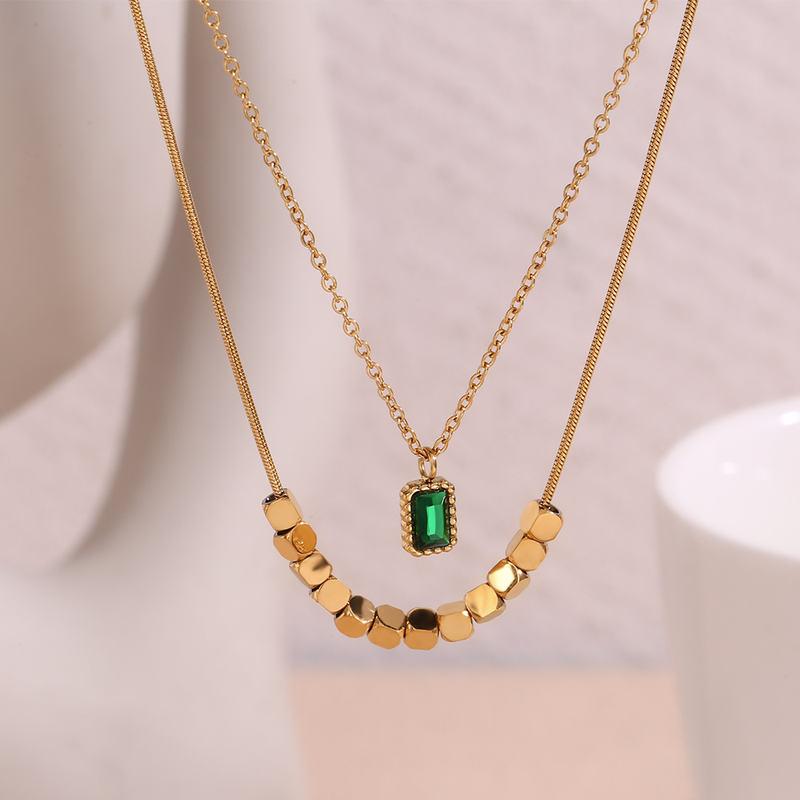 18K Gold Plated Green Rhinestone Pendant Double-Layer Necklace