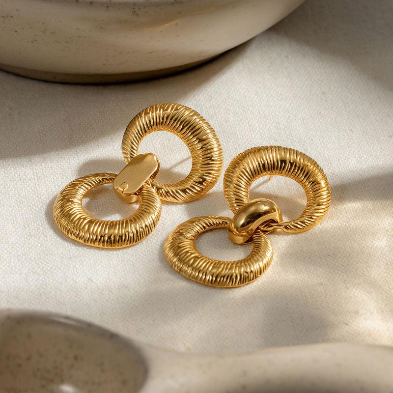 18K Gold Plated Stainless Steel Double Loop Textured Pendant Earrings – Tarnish-Proof, Statement Jewelry for Women