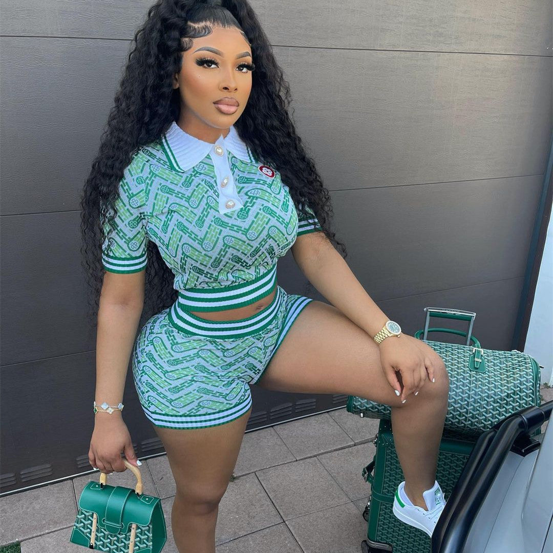 Retro Casual Patchwork Rib Short Sleeve Shorts Set