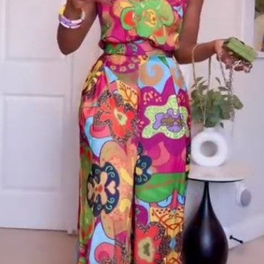 Women's Fashionable Printed Lantern Sleeve Shirt Wide-leg Suit