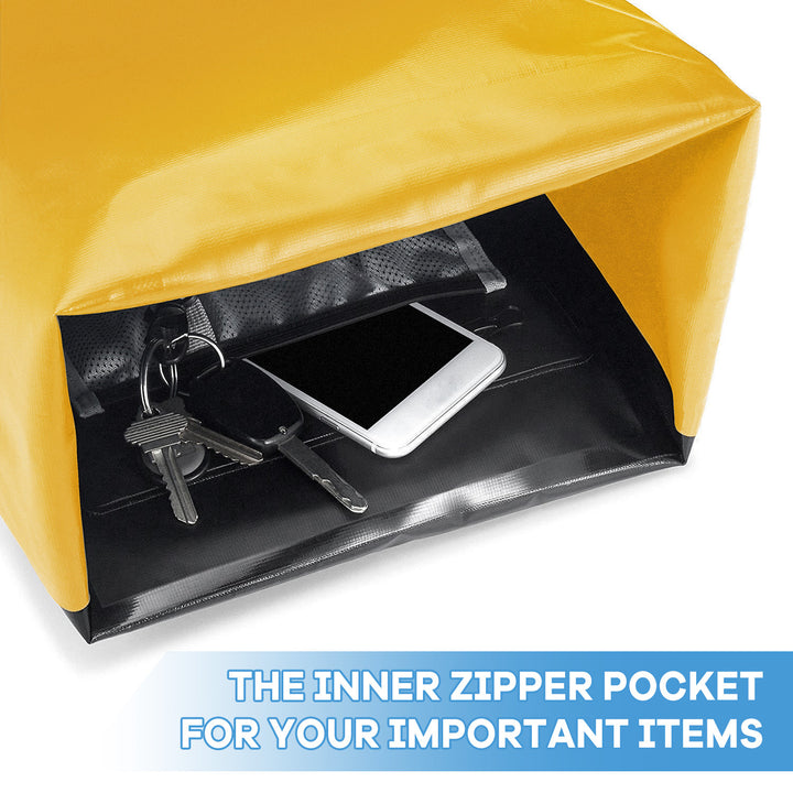 500D PVC dry bag backpack features a large 35L main compartment that has a roll-top closure and single reinforced strip.