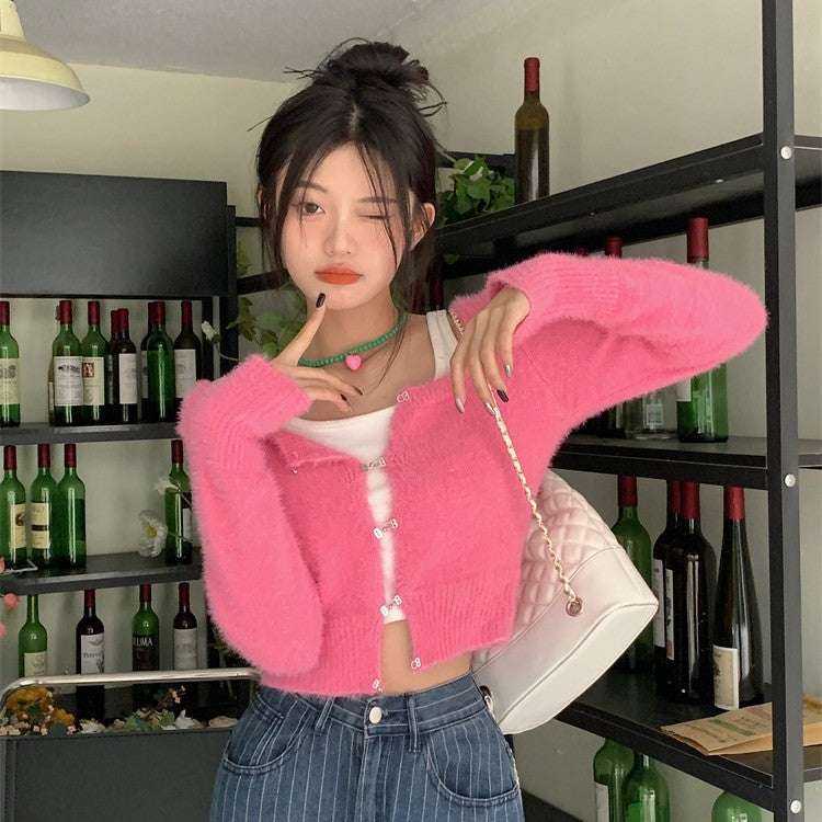 Coffee Colored Imitation Mink Velvet Knitted Cardigan For Women