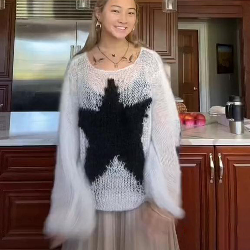 American Vintage Street Fashion Star Stripe Spliced Round Neck Loose Sweater