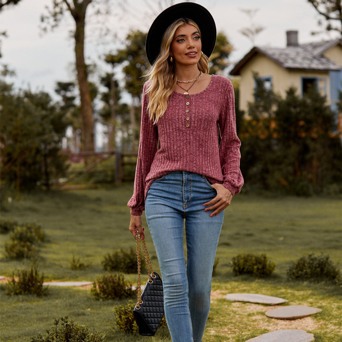 Women's Round-neck Sunken Stripe Brushed Solid Color Button Top
