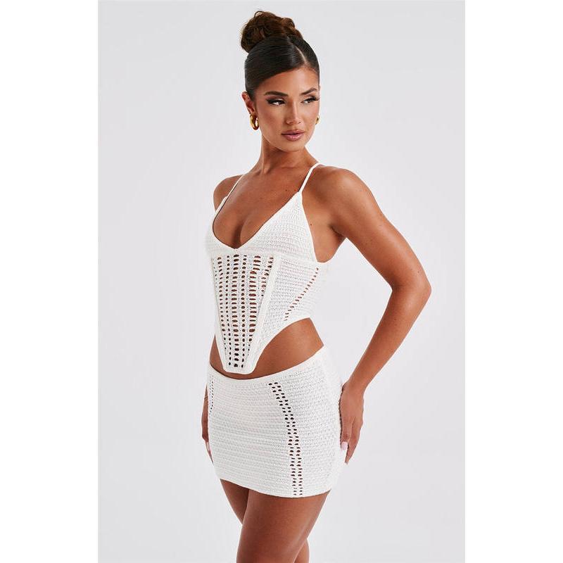 - Design: Backless lace-up crop top and mini skirt with V-neck collar and hole decoration.