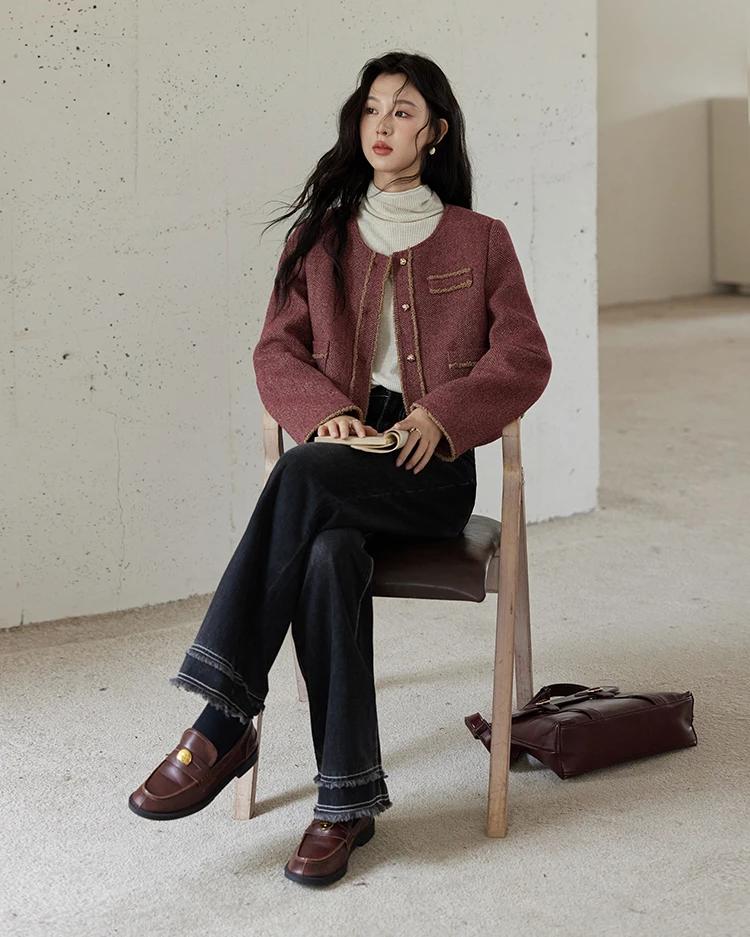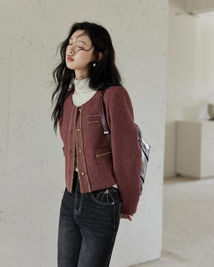 The *Plaid Tweed Short Jacket* stands out with its high-quality materials and eye-catching contrast color accents. The French O-neck design adds a touch of elegance, while the plaid tweed fabric brings a classic, retro vibe to your outfit. This jacket is not only fashionable but also functional, providing warmth and comfort while ensuring you look your best. The versatile design allows you to effortlessly transition from day to night, making it a must-have addition to your winter wardrobe.