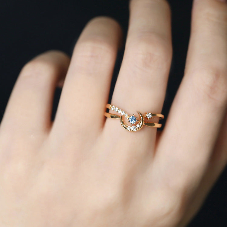 S925 Sterling Silver Zircon Simple Star And Moon Set Ring
