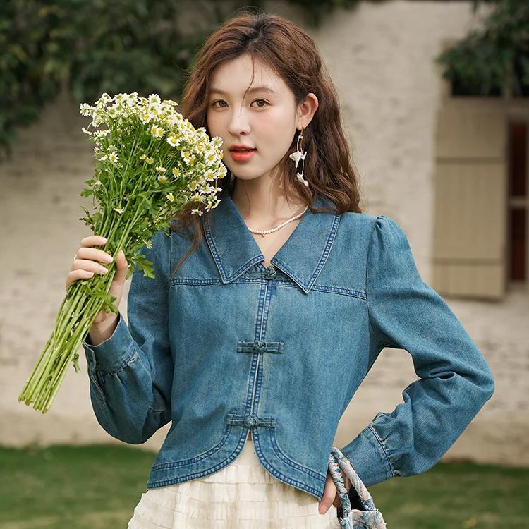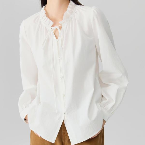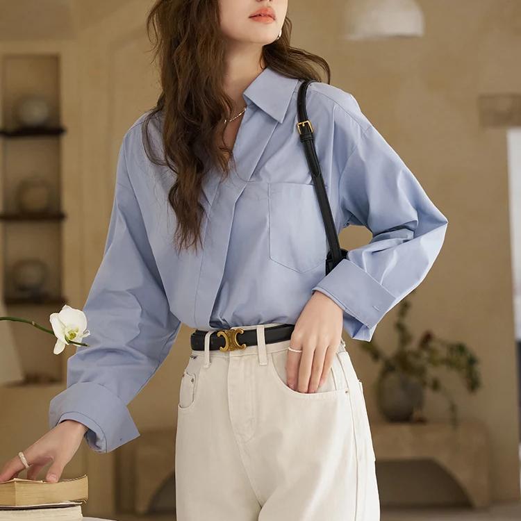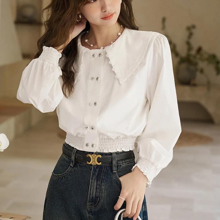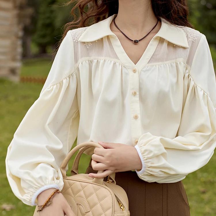 French Retro Turn-down Collar V Neck Long Sleeve Shirt for Women