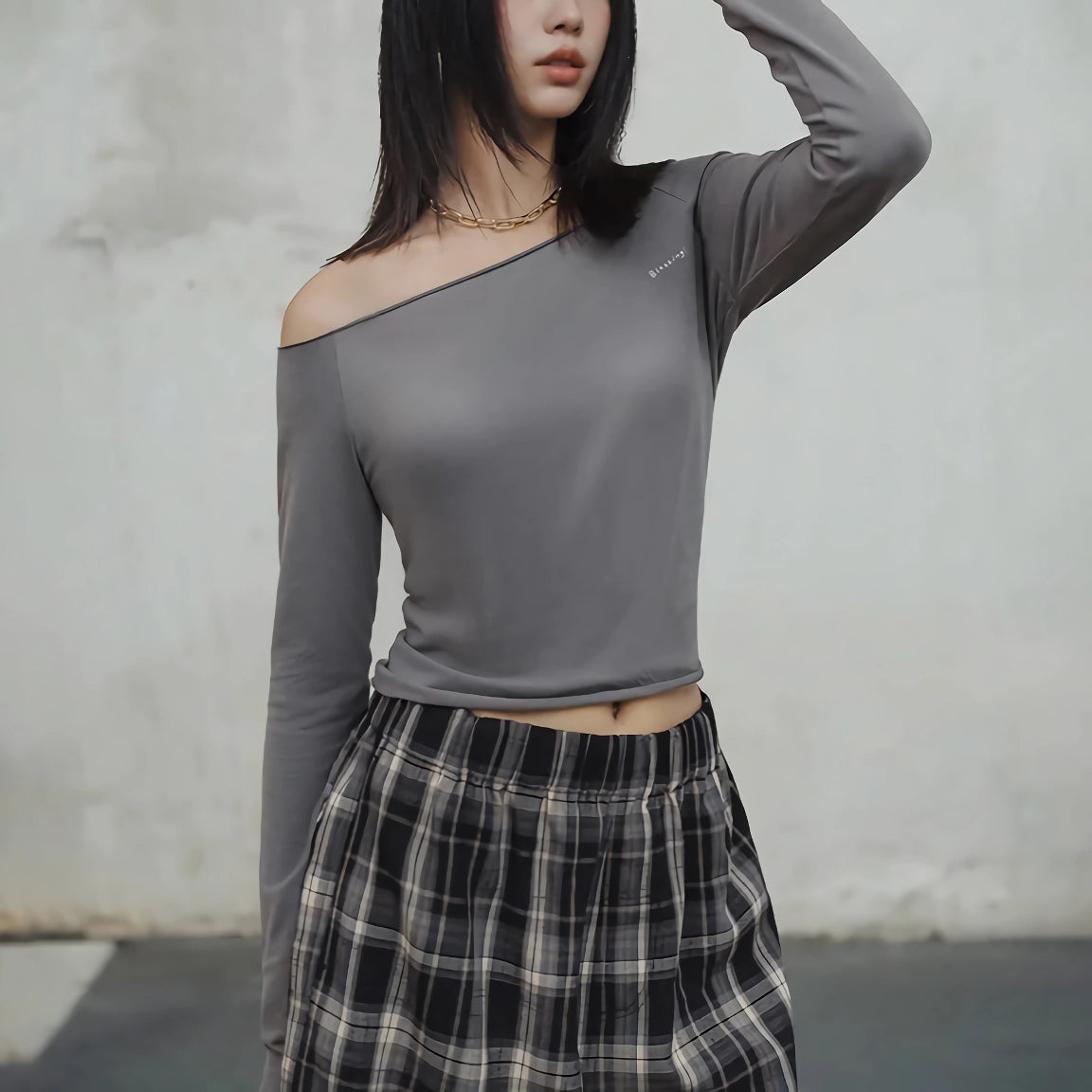 Elegant Slash Neck Long-Sleeved Gray T-Shirt for Women