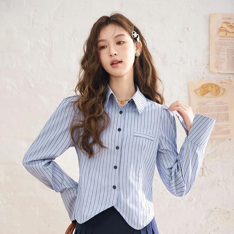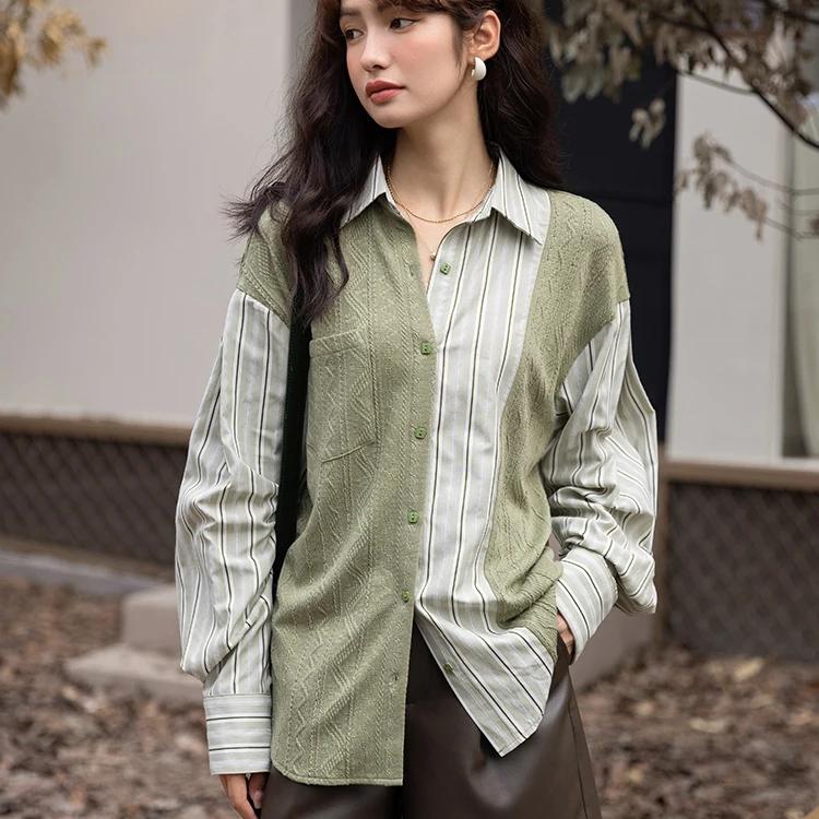Autumn Korean Knitted Patchwork Striped Turndown Collar Casual Tops for Women