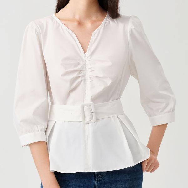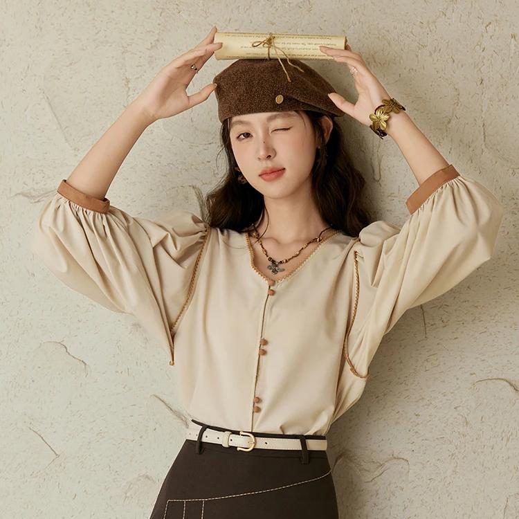 French Retro V-neck Lantern Sleeve Casual Shirt for Women