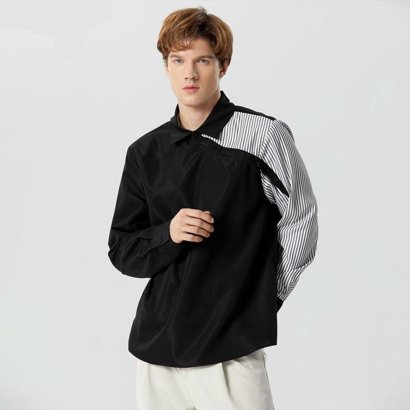 Striped Patchwork Lapel Men’s Long Sleeve Casual Shirt