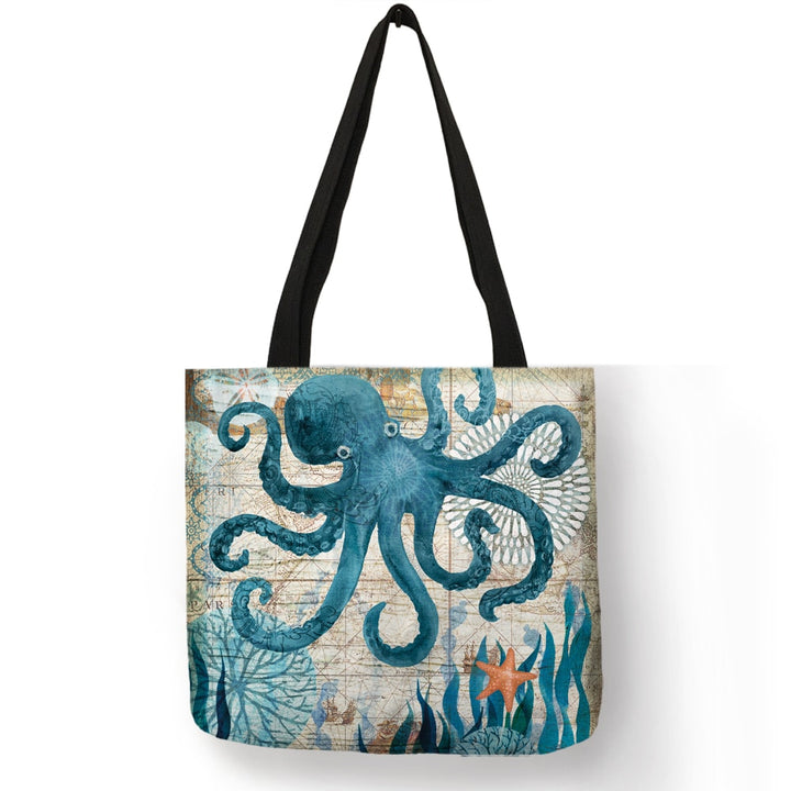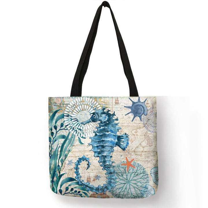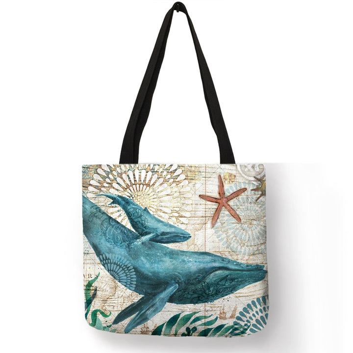 Sea Themed Printed Linen Shopper Shoulder Bag