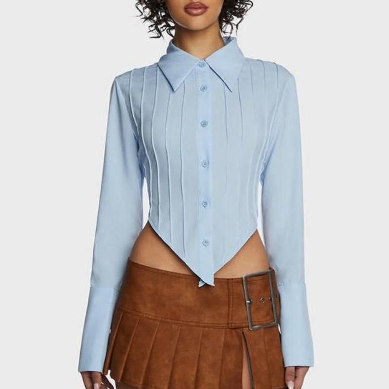 Chic Blue Lace-Up Back Blouse with V-Shaped Hem