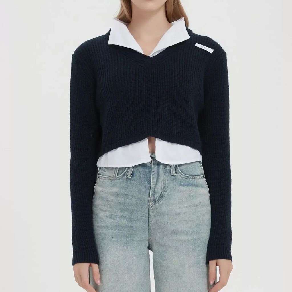 Autumn Long Sleeve Polo Neck Casual Stripe Blouse & Knitted Vest Set